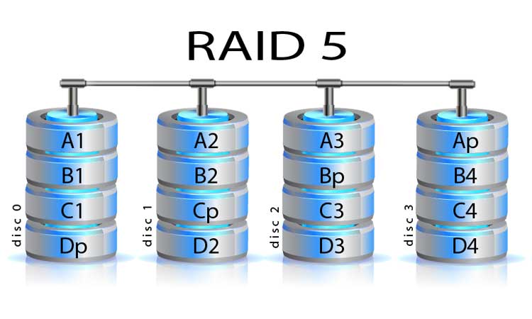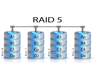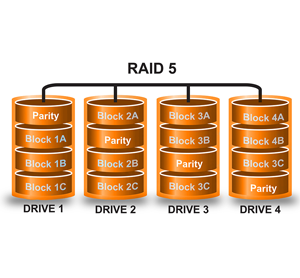 A RAID 5 data storage system is a multi hard disk drive configuration (Array) of normally 4 x hard drives or above. System data is written to the individual hard disk drives under the control of a specific hardware or software RAID 5 controller. The RAID 5 controller ensures that the system data is written (stored) in blocks sequentially from one drive and then another, this is called striping.
